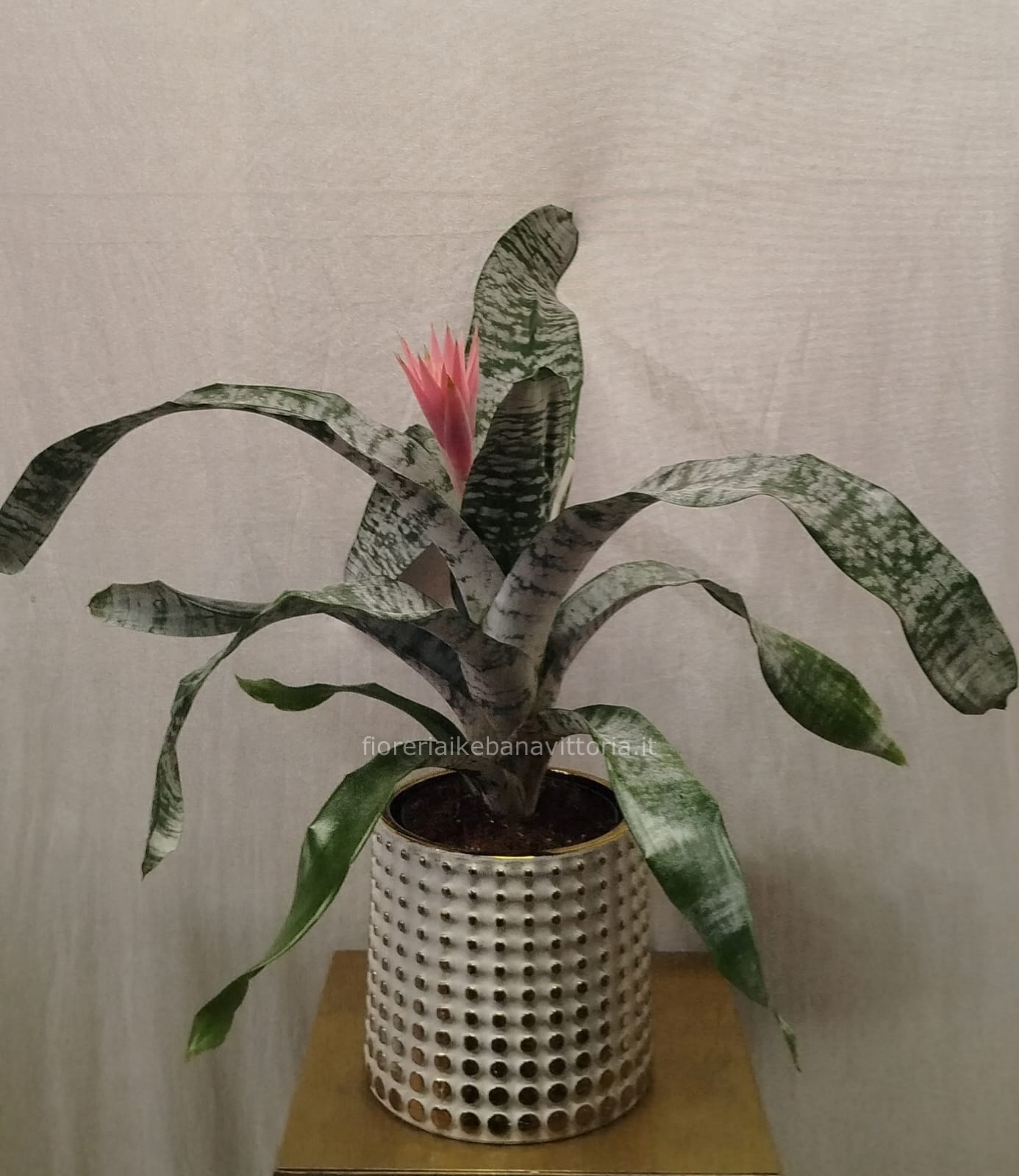 | Pianta di aechmea con vaso borchie dorate Cod. 125992 | € 50,00 | Quantità : | |